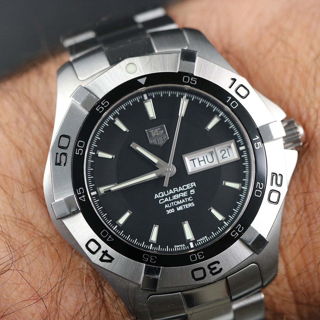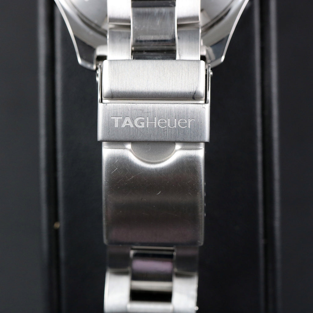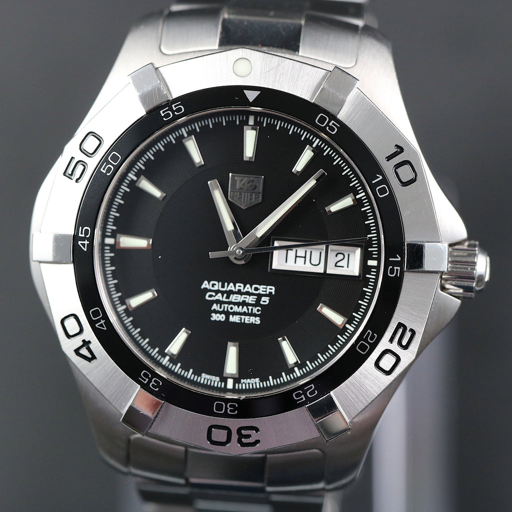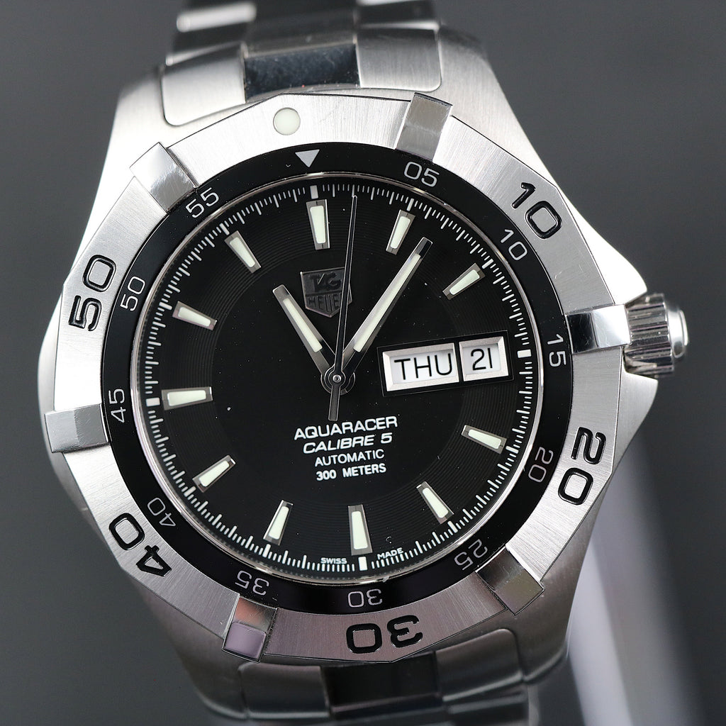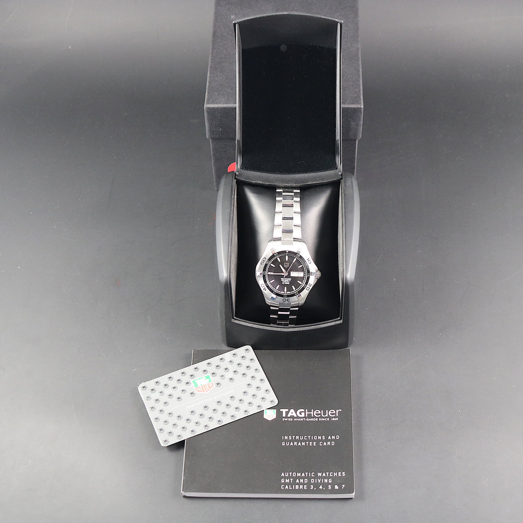 Tag Heuer, very good condition, with reference WAF2010 - Aquaracer with black dial. It is engraved on the dial “Aquaracer – Calibre 5 – Automatic - 300M – Swiss Made”. The hours are marked with white batons. The window for the date and day is at 3 o’clock. The hands are white with baton style. The watch comes with a black/Steel bezel graduated up to 50. The watch has a Tag Heuer screwed crown. It is a stainless-steel case with engraved “Swiss made since 1860 –Tag Heuer 300 Meters – 1000 FT – Automatic – Sapphire Crystal – WAF 2010 – RKQ8090”. The watch has an automatic movement with caliber 5 and 26 jewels. The watch has a stainless-steel bracelet with Tag Heuer double clasp. It is a full set with box and papers. The width between lugs is 20mm and the length of the bracelet is over 7.5 inches.