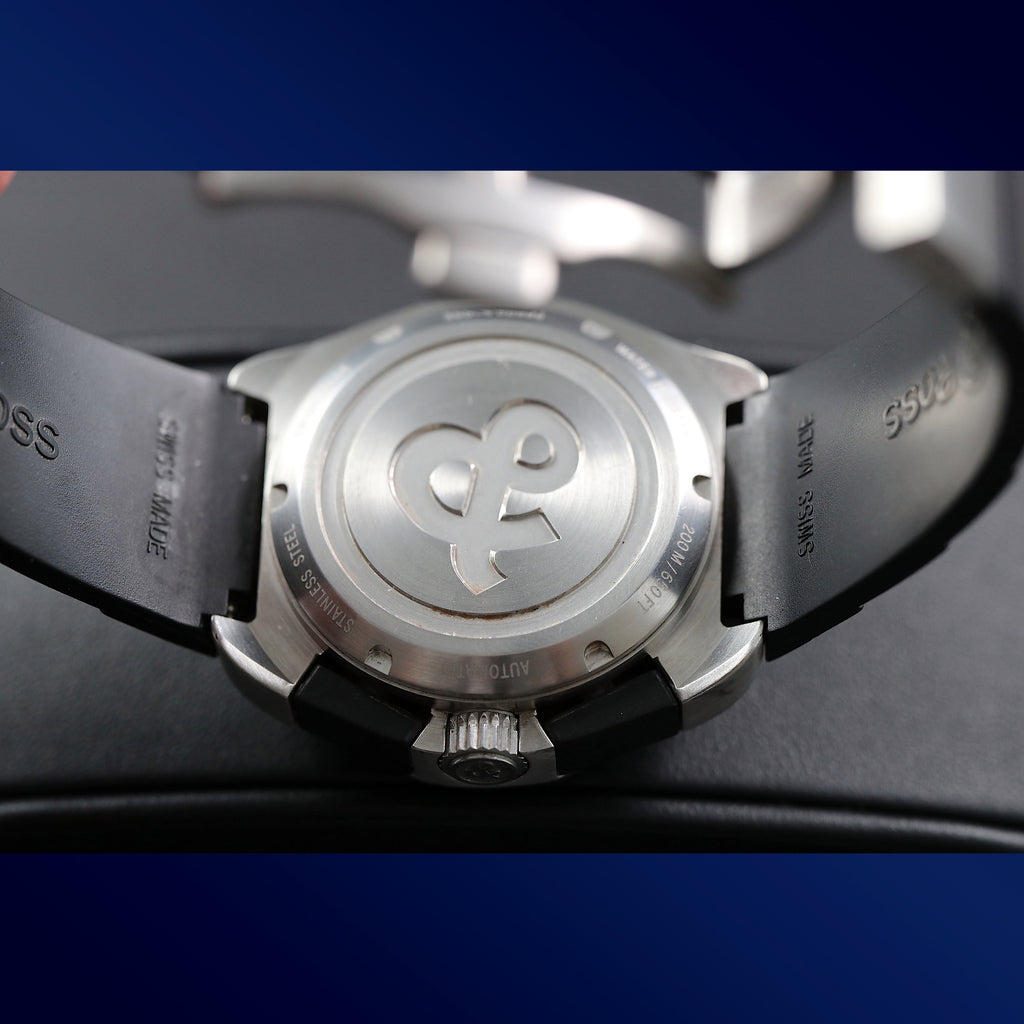 Bell & Ross 300-S Space 3 chrono comes with a round black dial and Arabic numerals for the hours. The watch has three sub-dials with hours at 6 o’clock, seconds at 9 o’clock and minutes are 12 o’clock. The date and day window are at 3 o’clock. The watch has an outer tachymeter graduated up to 300. The hands have stick design with red or white colors. It is a Swiss Made model. The watch comes with their game changing “T-Crown system”, a telescopic crown that rests flush with the case when fully screwed down and recessed chronograph pushers in rubber. The watch has a screwed back case with engraved outside “Stainless steel – Swiss Made – 300-S 00686 – Water Resistant – 200M 650FT – Automatic”. The watch has an automatic movement with Valjoux 7750 and 25 jewels. The watch comes with the original B&R rubber bracelet and double clasp stainless steel clasp. The bracelet fits a 7.5 inches wrist. The watch comes with the original box. Very nice collectible timepiece.