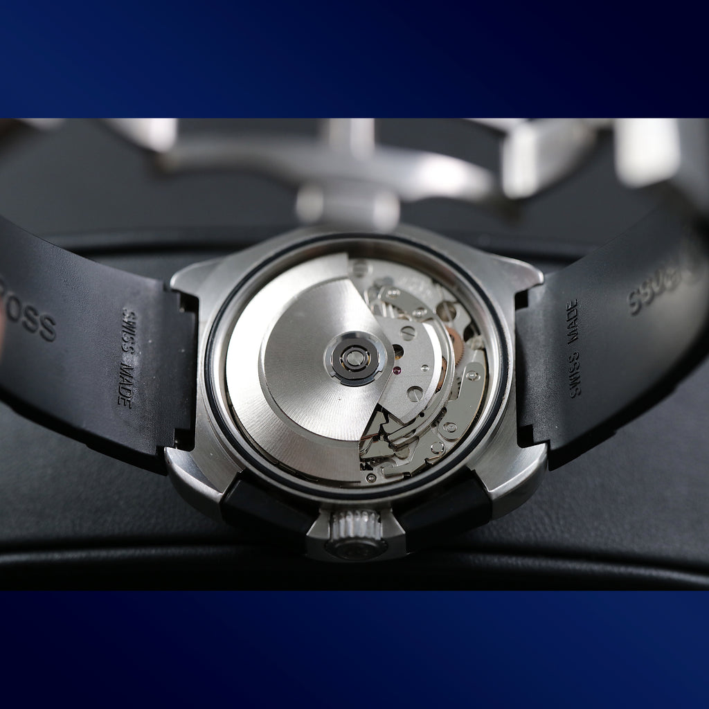 Automatic movement with caliber Valjoux 7750 with 25 jewels and 28,800 A/h. Power reserve is 48 hours. Based on the Valjoux 7733.