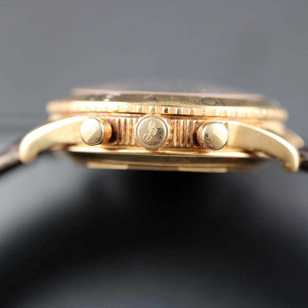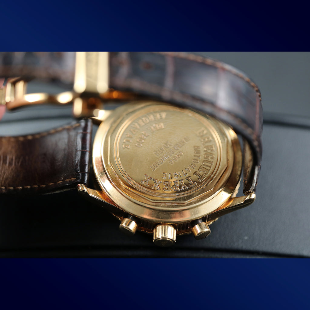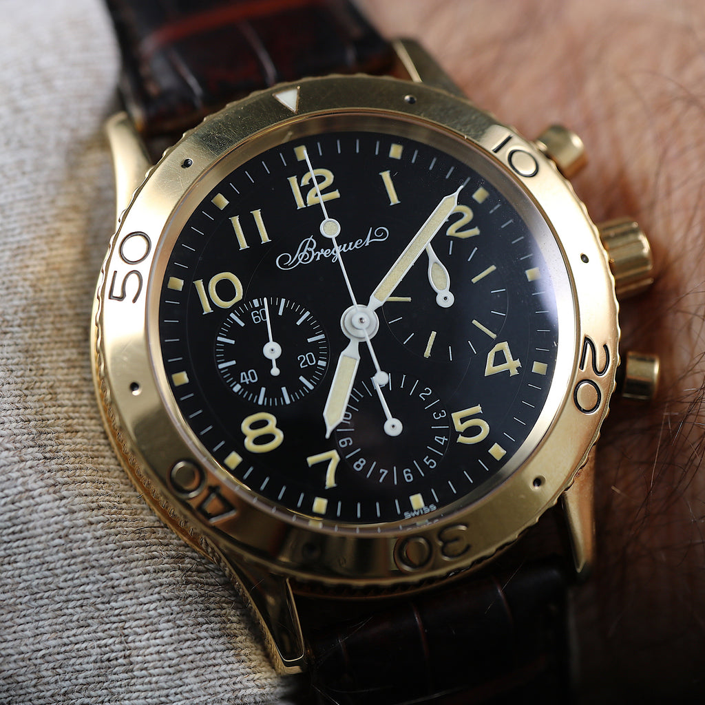 Top of the art Breguet Aeronavale Type XX with reference 3800BA-92-1W6 with black round dial and Arabic numerals for hours. The watch comes with 3 sub dials, 3 o’clock for minutes, 6 o’clock for the hours and 9 o’clock for seconds. All the hands are white/mustard with “Sword” style for hour and minute hands. It is a “Swiss” model. It is a screwed crown with the Breguet logo. The watch has an outside bezel graduated up to 50. It is a 18K yellow gold screwed back case with engraved outside “Breguet Type XX – Automatique – 695G – Water Resistant 20ATU – Ref 3800 – Aeronavale”. It is an automatic movement with caliber 582 and 25 jewels. The watch has a brown alligator strap with yellow gold Breguet double clasp. Width between lugs in 19mm. It is full set with box, Certificat d’orgine, service receipt dated 2007 and appraisal from 1995.collectible.
