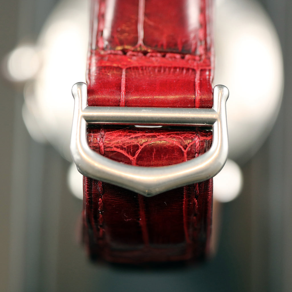 Cartier Pasha 150th anniversary with reference W3102255 in stainless steel with round silver dial, Roman and Arabic numerals for hours and minutes. It is a “Swiss” model. The window for the date is at 4 o’clock. The hands are black with “Losange” style. It has a rotative bezel graduated up to 50. The face is cover with a grid to remember the trench watches of the first world war. The crown has a burgundy cabochon. It is a screwed crown with a small chain. It is a screwed back case with engraved outside “Pasha de Cartier – Water Resistant – 330 ft 100M -1244/1847”. The watch comes with an automatic movement and caliber ETA 2892A2 and 21 jewels. The watch comes with a Cartier burgundy alligator strap and Cartier stainless steel double clasp buckle. The width between the lugs is 20mm. The watch comes in a Cartier box, original paper, Certificate of warranty and booklet.