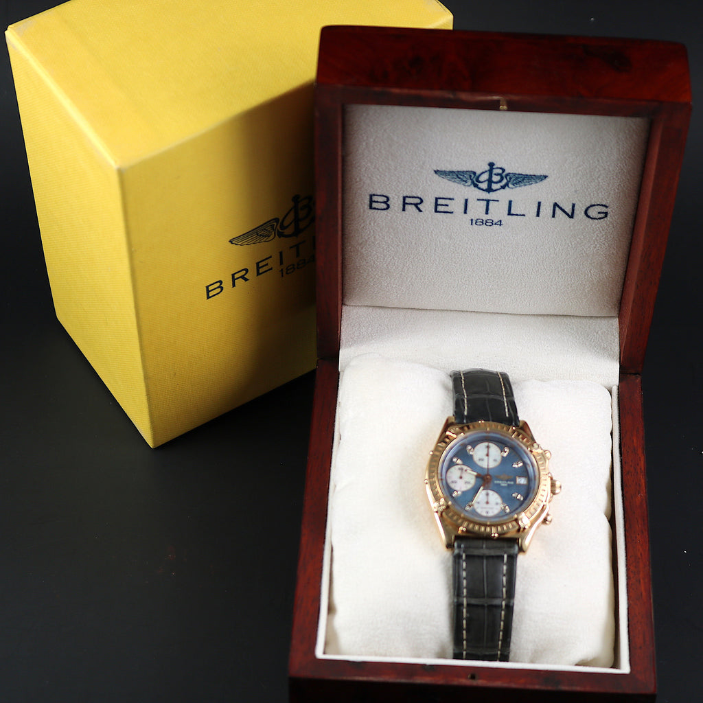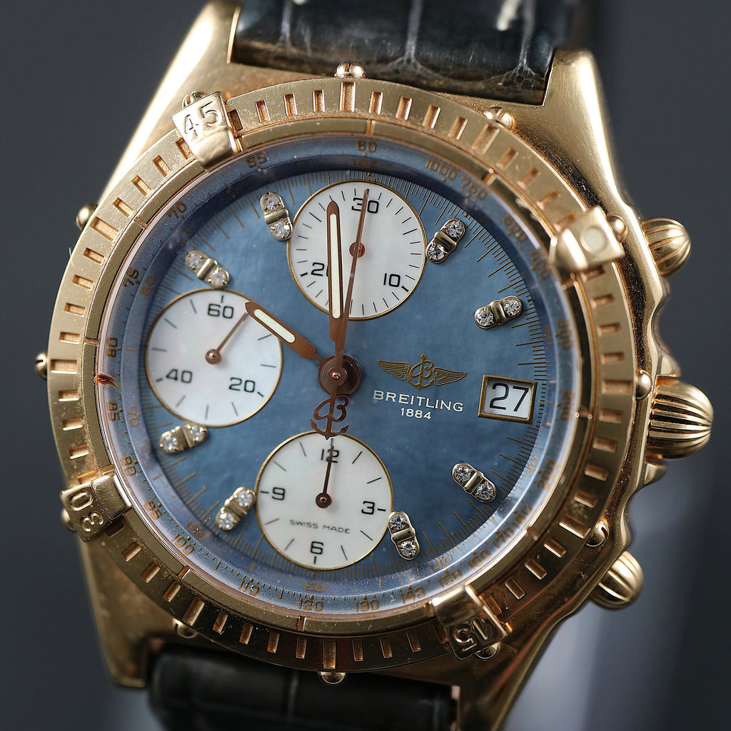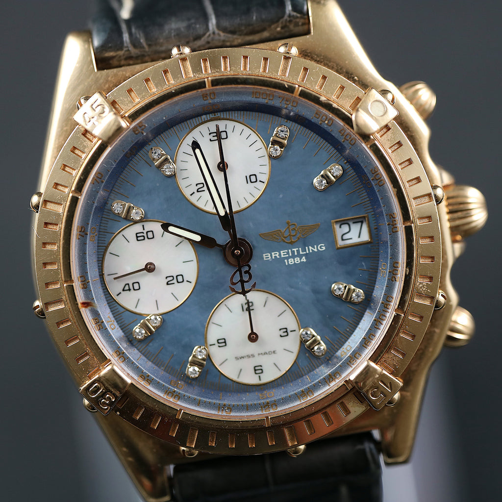 Breitling Chronomat Automatic with reference H13048 with a round mother of pearl dial with diamond marking each hour. The watch has three sub dials, hours at 6 o’clock, seconds at 9 o’clock and minutes at 12 o’clock. The hands are in gold with “Baton” style. The date window comes at 3 o’clock. On the outer of the dial comes a tachymetre graduated up to 1000. The watch has a unidirectional rotative bezel with marks for 15, 30 and 45. The watch has a screwed crown. It is a screw back case with engraved “Chronograph - 100 m – Manufacture Suisse – H13048 – 18K – 1 – 0135 - The watch is waterproof 10 ATM. The watch has an automatic movement with caliber Breitling 13. The watch comes with a blue alligator strap with Breitling rose gold double clasp. It is a full set with box, paper and warranty.