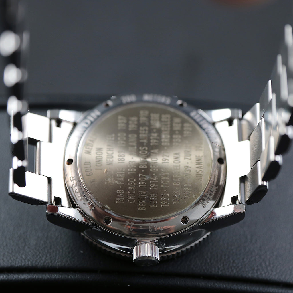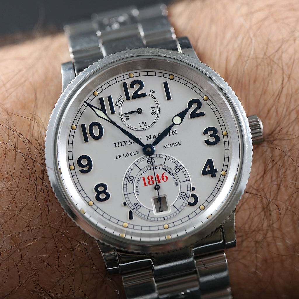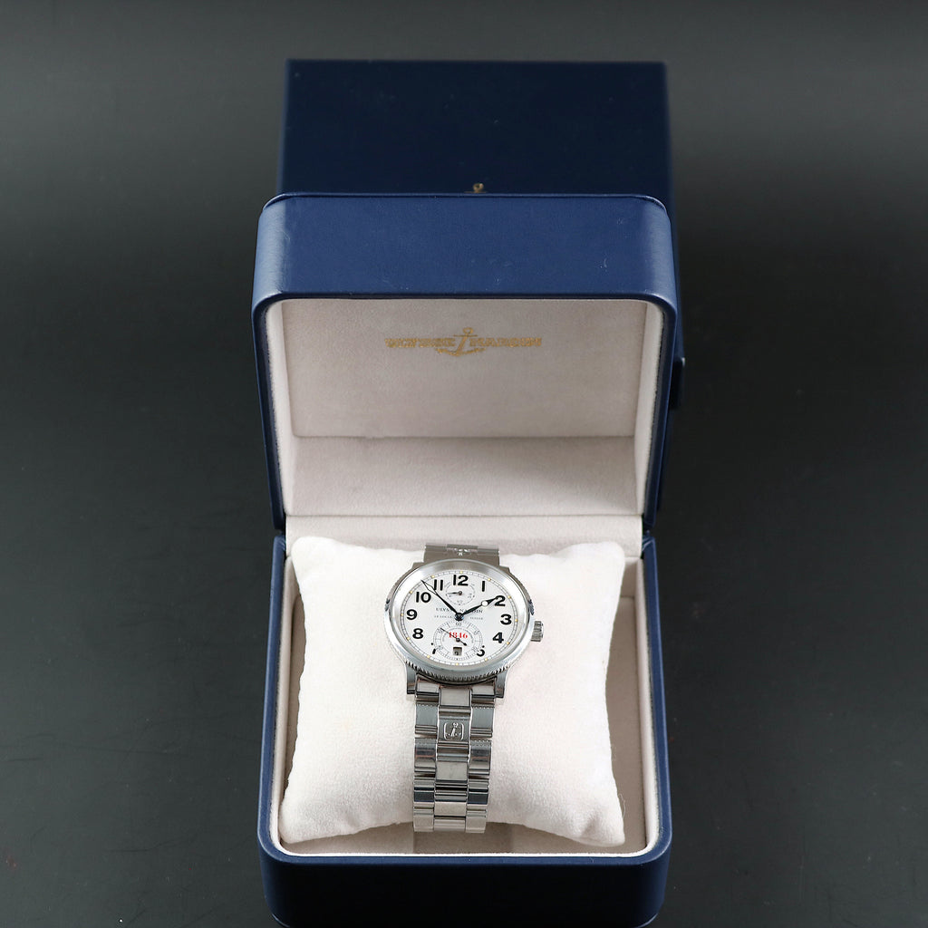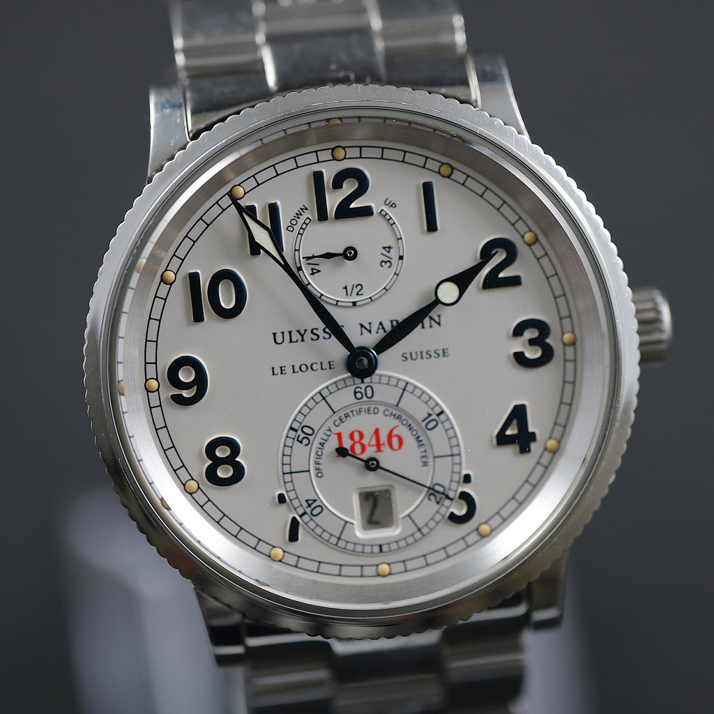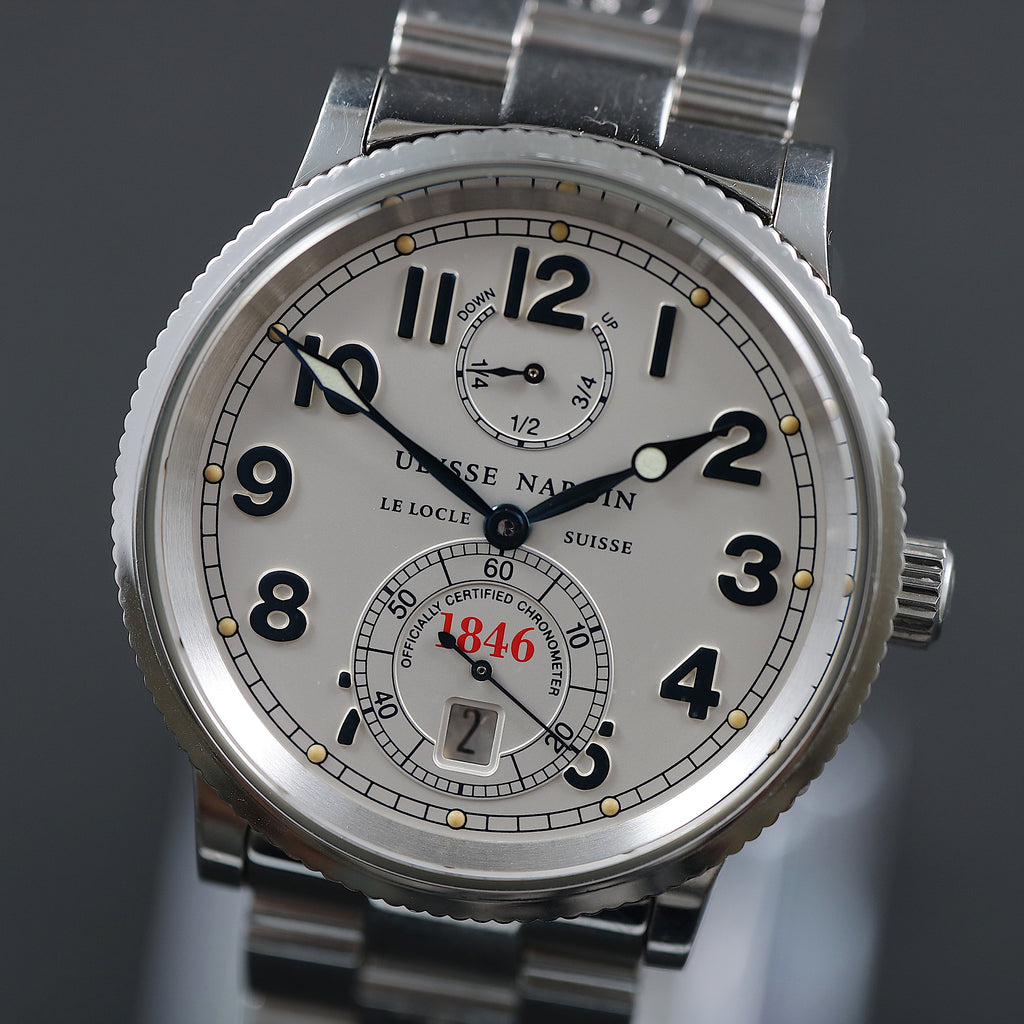 Beautiful Ulysse Nardin 1846 Marine Officially Certified Chronometer with reference 263.22. The dial has a round shape with a light gray color and blue Arabic numerals marking each hour. 2 sub dials with power reserve at 12 o’clock and seconds at 6 o’clock. On the dial is engraved Ulysse Nardin – Le Locle Suisse – 1846 – Officially Certified Chronometer”. The date is at 6 o’clock. It has a screwed crown. The hands have a modern shape of Breguet style and color. It is a stainless-steel screwed back case with all the prices engraved in the back as well as “Ulysse Nardin – 200 meters – Marine Chronometer – 263.22”. It is an automatic movement with caliber 26 and 28 jewels. The watch comes with a stainless-steel bracelet and double clasp. It fits a 6.50 inches wrist. It is a full set with box, warranty and COSC certificate.