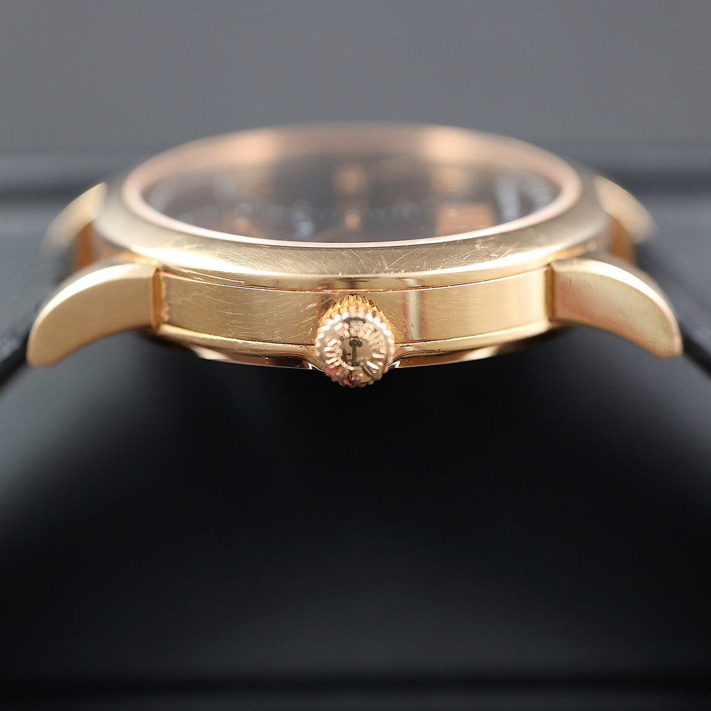 Beautiful Lange 1 with a round black dial and two sub-dials, 4 o’clock for the second and 9 o’clock for the time with Roman numerals and dots for each hour. At 3 o’clock you have the power reserve indicator. The big date windows are at 1 o’clock with the pusher at 10 o’clock. It is a Made in Germany model. The watch has a crown with logo. It is a pink gold case with sapphire exhibition case back and engraved around A Lange & Sohne – Glahsutte SA”. It is a manual winding movement with the caliber L901.0 and 53 jewels. The watch comes with a black strap “Camille Fournet” and the original A Lange one. The buckle is in pink gold with the name Lange. Width between lugs is 20mm. It is FULL SET in good condition with box, guarantee, manual of operation and tags. The watch has been tested at a Lange and Sohne boutique and it is in very good working condition.