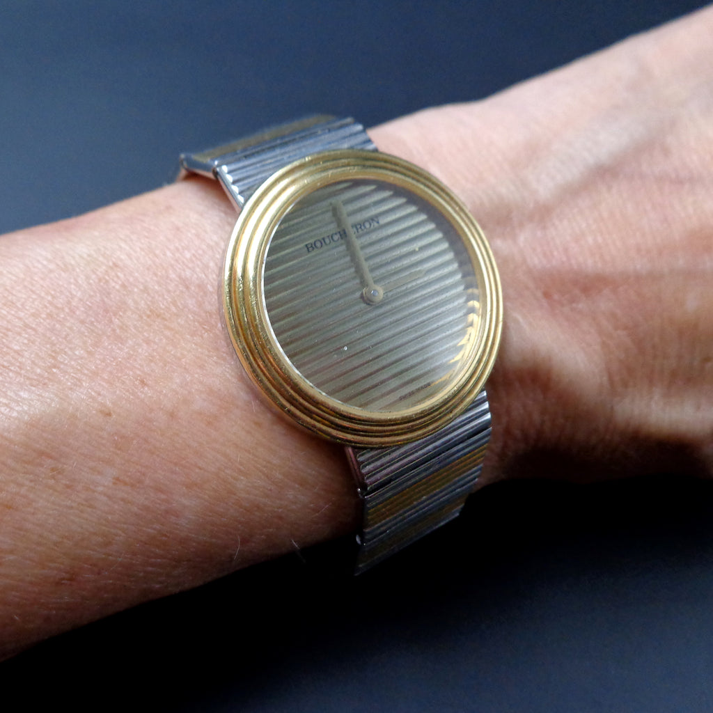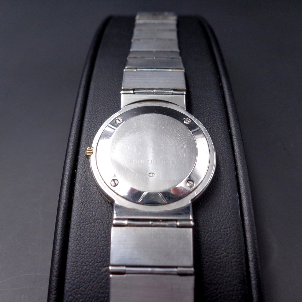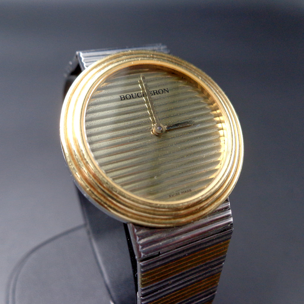 Very nice Boucheron with reference 76963 with round Polo dial and gold stick hands. It is a Swiss Made model. The watch comes with a gold bezel and stainless-steel screwed back case with engraved outside 76963 – Boucheron. The bracelet is in stainless steel and gold. The length of the bracelet is 6.5 inches and width between lugs is 17mm.