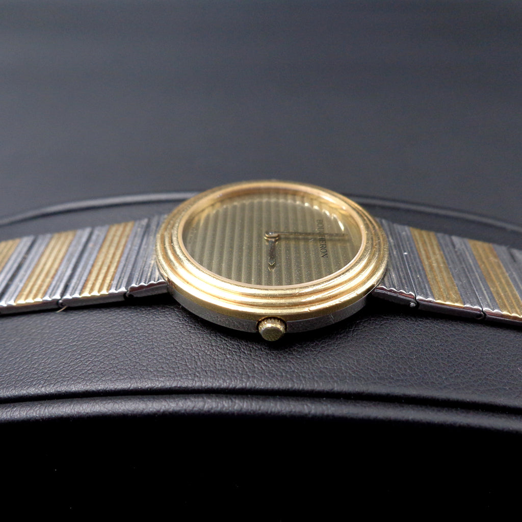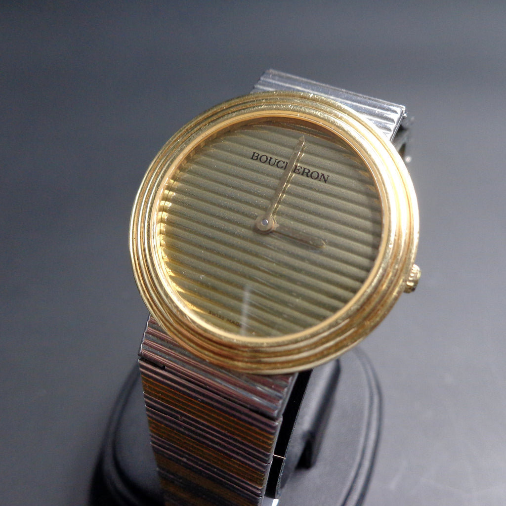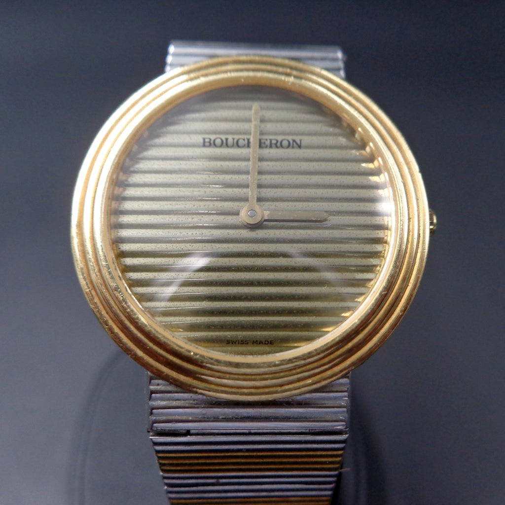 Very nice Boucheron with reference 76963 with round Polo dial and gold stick hands. It is a Swiss Made model. The watch comes with a gold bezel and stainless-steel screwed back case with engraved outside 76963 – Boucheron. The bracelet is in stainless steel and gold. The length of the bracelet is 6.5 inches and width between lugs is 17mm.