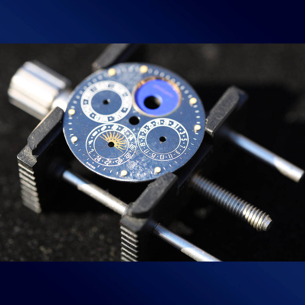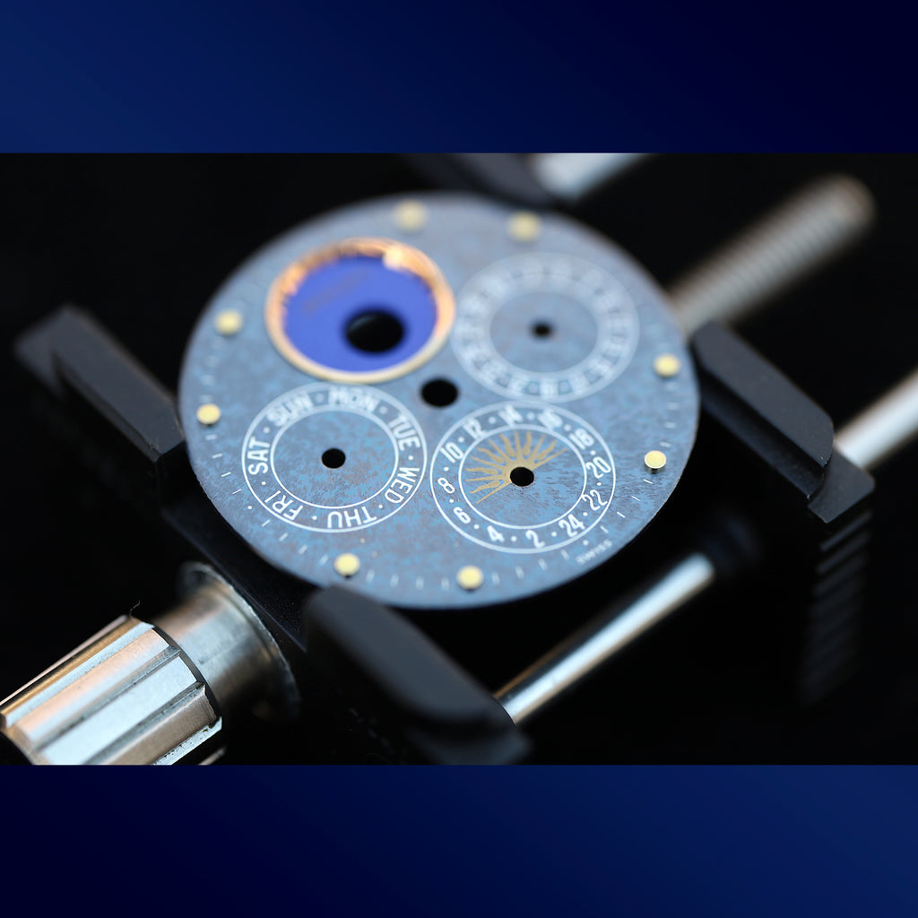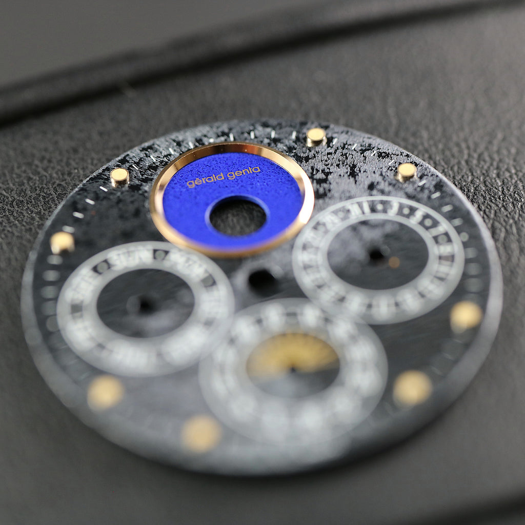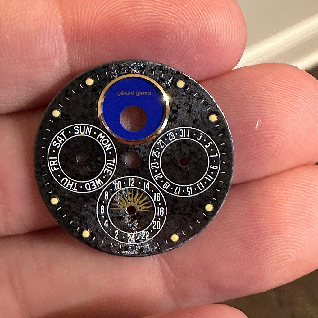 Gerald Genta black dial full calendar and moonphase onyx. It has 3 sub dials for the date, day and 24 hours, It is a Swiss model. Luminous are good. Beautiful overall patina.