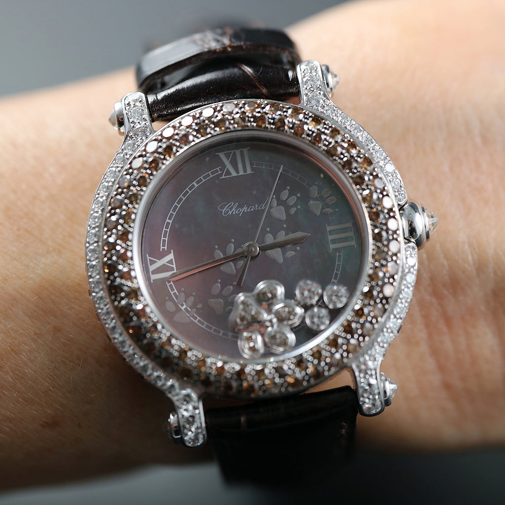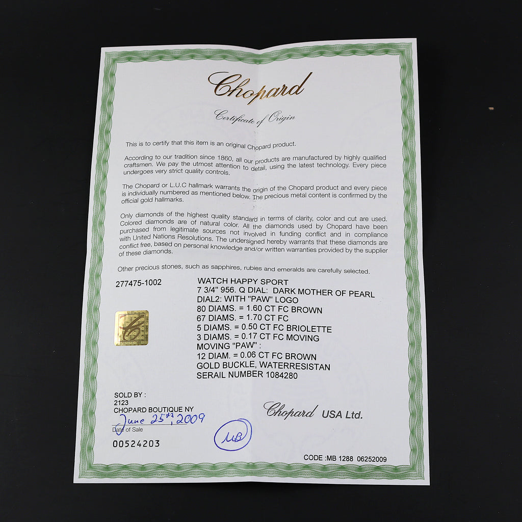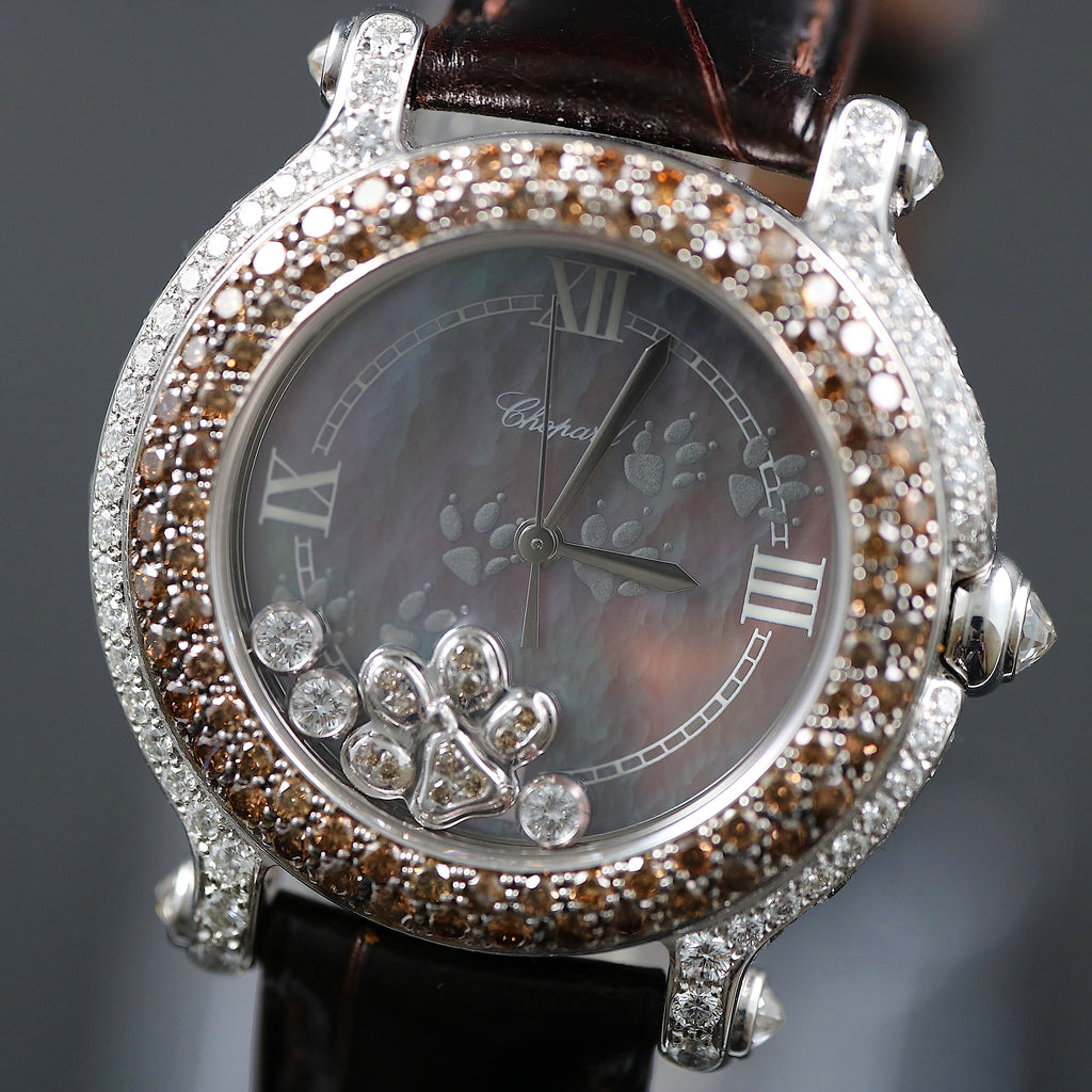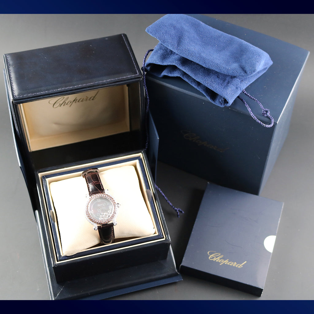 Chopard Happy Sport with reference 277475-401 with round mother of pearl brown dial with grey Roman numerals for 3, 6, 9 and 12 o’clock. The window for the date is at 6 o’clock. It is a Swiss Made model. The watch comes with white gold Sword hands. Between the dial and crystal, come floating diamonds. The bezel has chocolate color diamonds and lugs are with diamonds too. The crown and end lugs come with diamonds. It is a 18K white gold screwed back case with engraved outside “Chopard Happy Sport – 27/7475 401 1084280 – 4144” The watch has a quartz movement. The watch comes with a brown alligator Chopard strap and stainless steel double Chopard clasp. It is full set with box, certificate of origin and booklets.