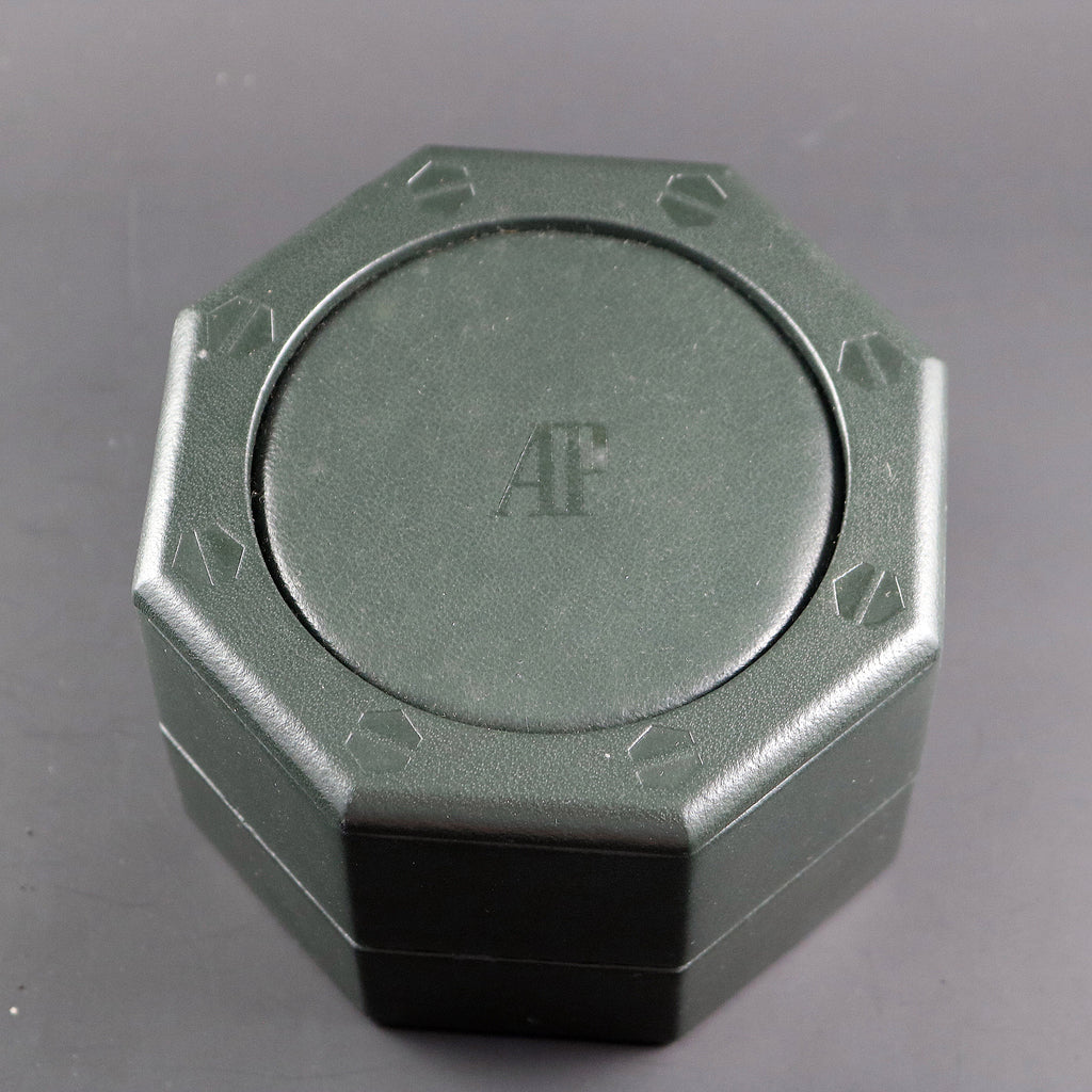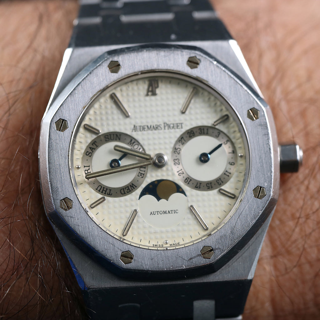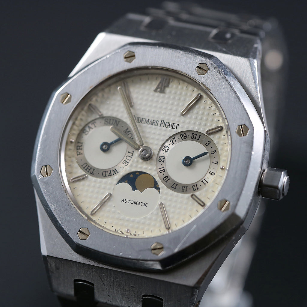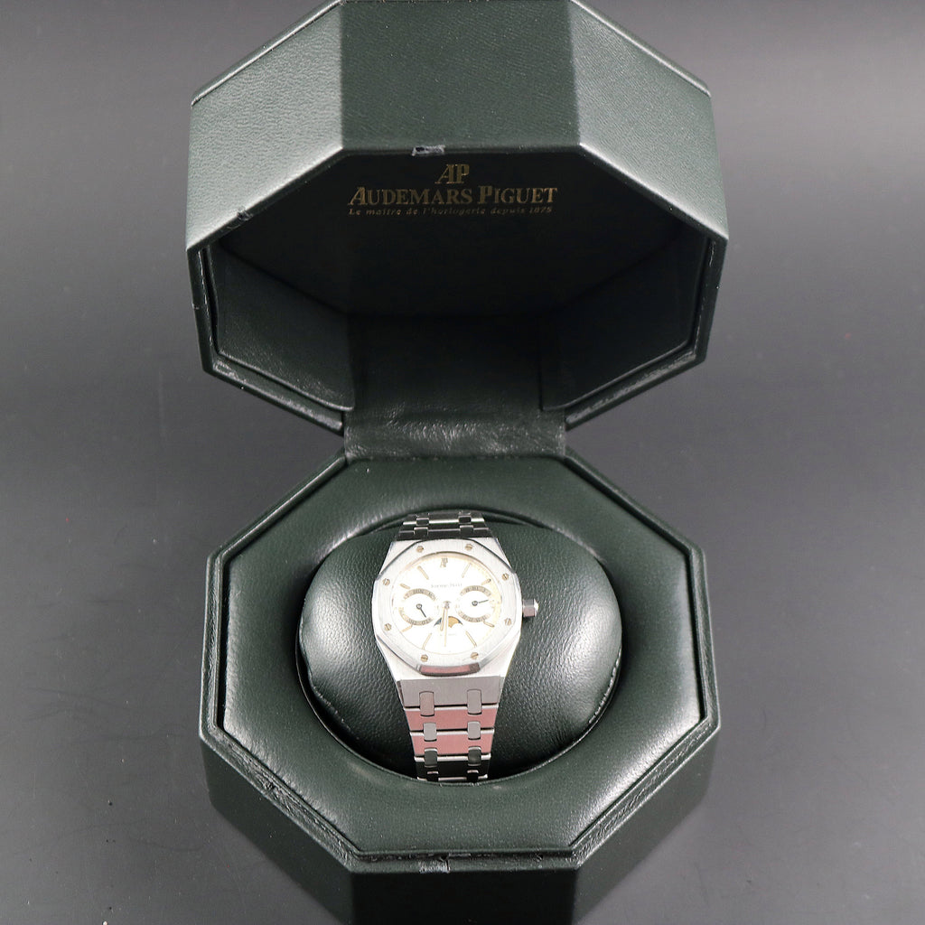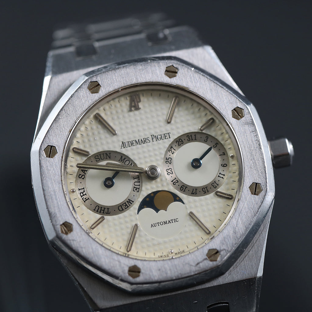 Beautiful Audemars Piguet Royal Oak “OWL” with guilloche cream dial and three sub dials at 3 o’clock with a silver ring for the date, 6 o’clock for the moon phase and 9 o’clock with a silver ring for the day. Each hour is marked with a stainless-steel baton. At 12 o’clock comes the “AP” logo. At 6 o’clock is engraved “Automatic”. The hands have a baton shape. It is a “Swiss Made” model. It is the original screwed crown. It is a stainless-steel screwed back case with the iconic screwed bezel. In the back is engraved “Royal Oak – 1743 – D-76498”. It is an automatic movement with caliber 2124/2825 with 32 jewels. The watch comes with a stainless-steel bracelet and an AP folding clasp. It fits a 7.50 inches wrist. The watch is not polished and has a lovely patina. The watch comes with the Certificate of origin and warranty. The watch comes with the original box and outbox. The watch has been serviced.