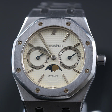 Beautiful Audemars Piguet Royal Oak “OWL” with guilloche cream dial and three sub dials at 3 o’clock with a silver ring for the date, 6 o’clock for the moon phase and 9 o’clock with a silver ring for the day. Each hour is marked with a stainless-steel baton. At 12 o’clock comes the “AP” logo. At 6 o’clock is engraved “Automatic”. The hands have a baton shape. It is a “Swiss Made” model. It is the original screwed crown. It is a stainless-steel screwed back case with the iconic screwed bezel. In the back is engraved “Royal Oak – 1743 – D-76498”. It is an automatic movement with caliber 2124/2825 with 32 jewels. The watch comes with a stainless-steel bracelet and an AP folding clasp. It fits a 7.50 inches wrist. The watch is not polished and has a lovely patina. The watch comes with the Certificate of origin and warranty. The watch comes with the original box and outbox. The watch has been serviced.