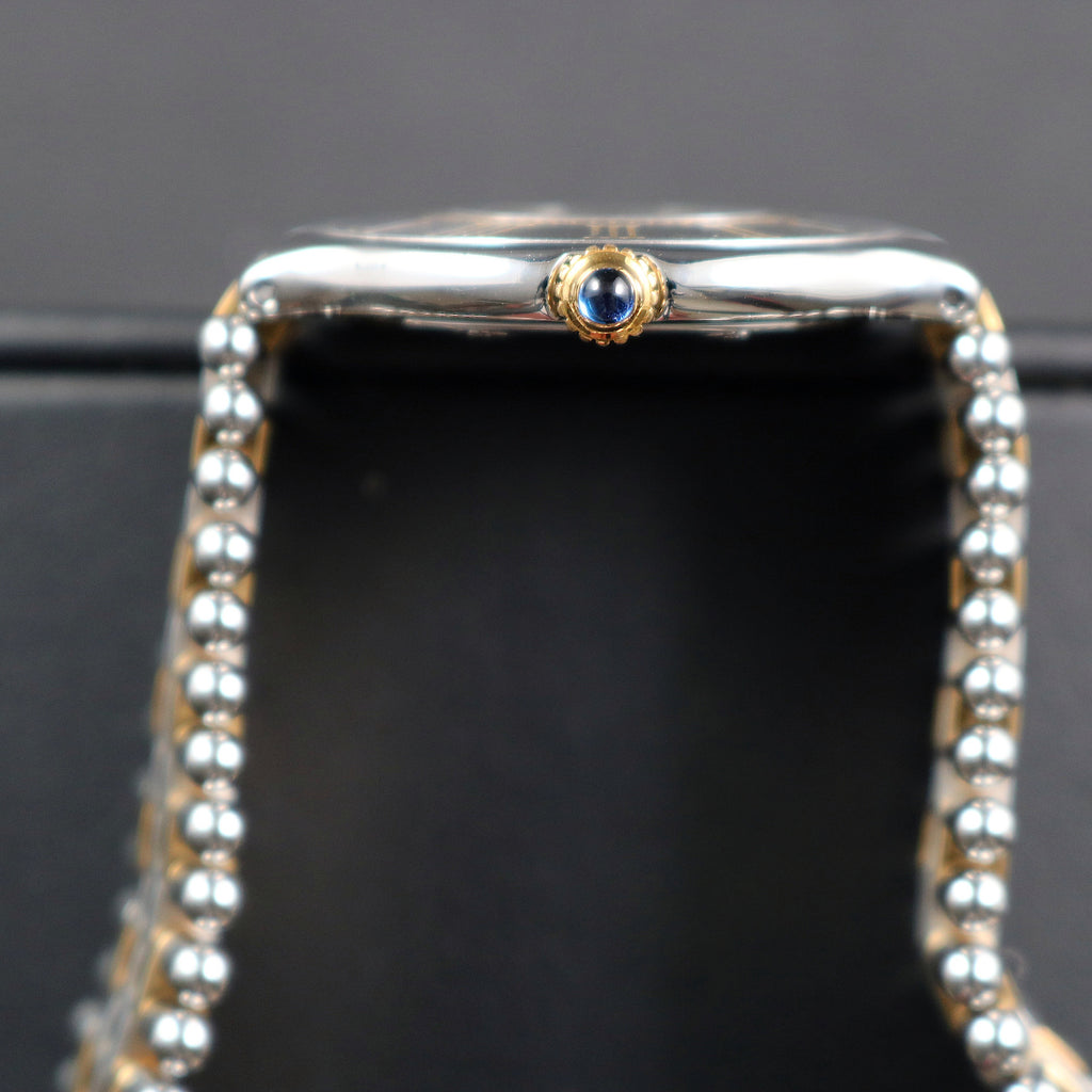 Must de Cartier 21 in stainless steel and gold with round silver dial. It is a “Swiss Made” model. The watch has an outer bezel with Roman gold numerals for hours and an inner gold ring for the minutes. The crown is in gold with blue cabochon. It is a stainless-steel screwed back case with engraved outside Must de Cartier 21 – 123 000 P – 010683 - Swiss Made - Quartz”. The watch has a quartz movement. It has a stainless-steel gold bracelet with double Cartier clasp. The width between the lugs is 16mm and the length is 6 inches.